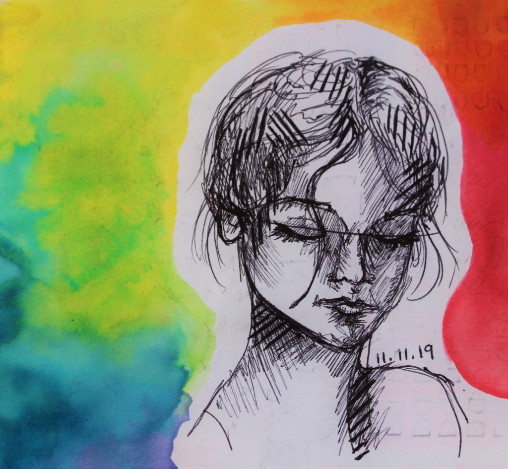 This is a colorful mixed media artwork using a black ballpoint pen complemented with a rainbow gradient painted with watercolor paints. I created this artwork on November 11, which is why it's titled "Angel Numbers."