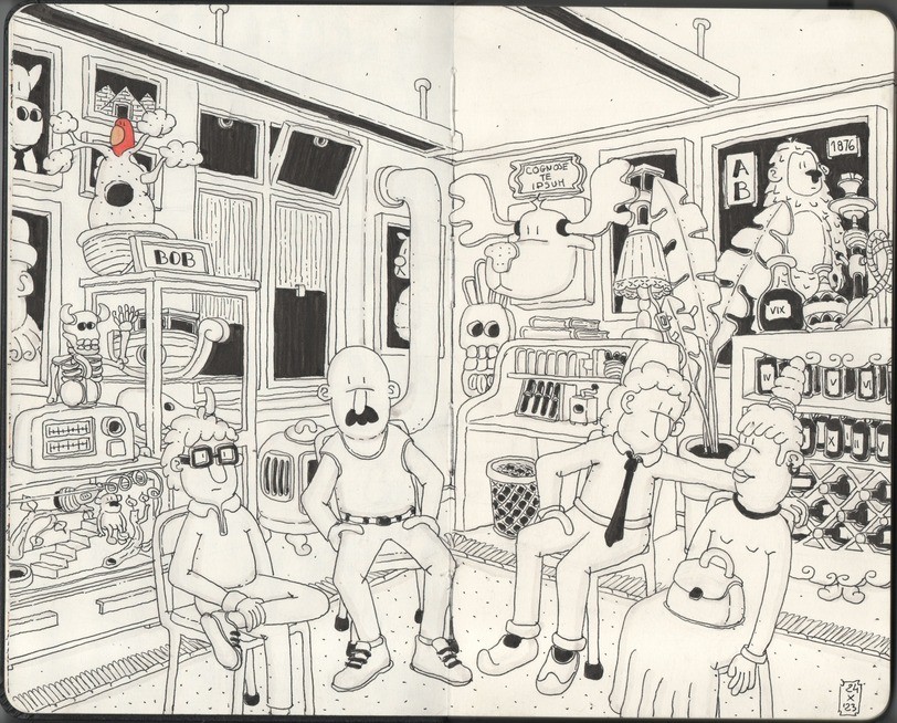 There is so much odd going on in the background, i feel like im watching a meeting of a secret, illegal club. Why all the skeletal decor and the bottles labled with roman numbers? God only knows what the four of them are capable of...