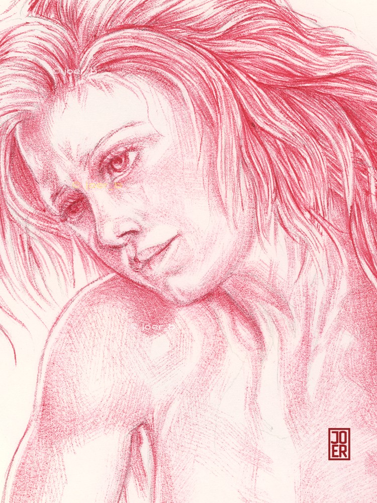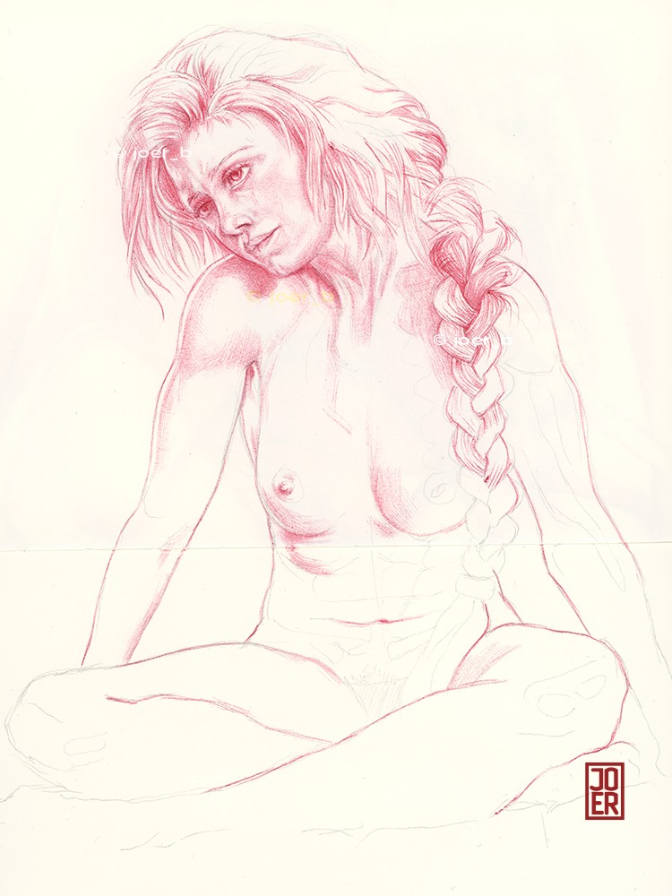 A drawing of Amy with her hair braided and tied with a red silk sash.