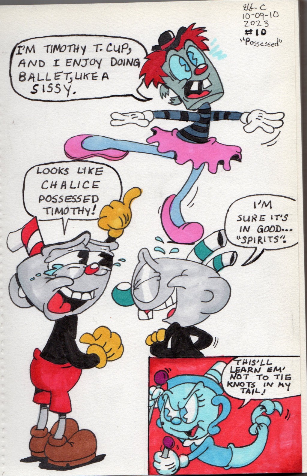 Another "Cuphead" themed fan art imvolving a "Drawtober23'" theme. This time it's posession. Every now and then, Timothy T Cup does get his commupence. But after while, he'll still get revenge.