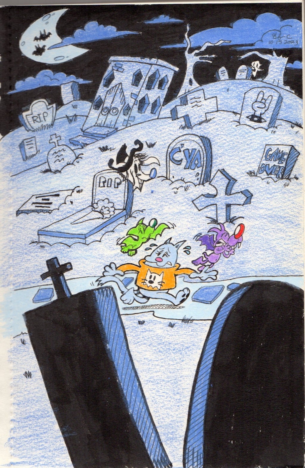 batsy, cartooning, cartoons, cat and bat, drawing, graveyard, illustration