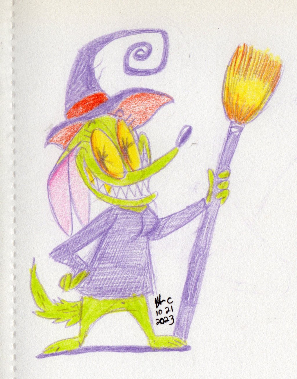 Drawn with various colored pencils, a witch dog.
