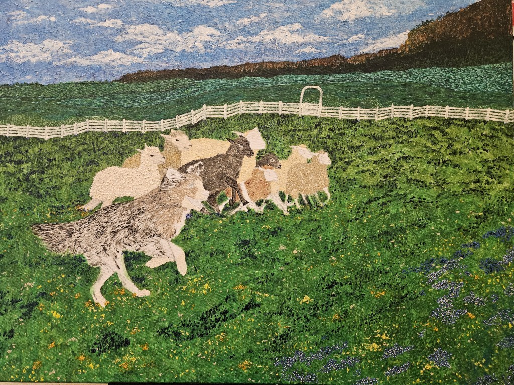 animals, blue bonnet field, dog, illustration, painting, sheep