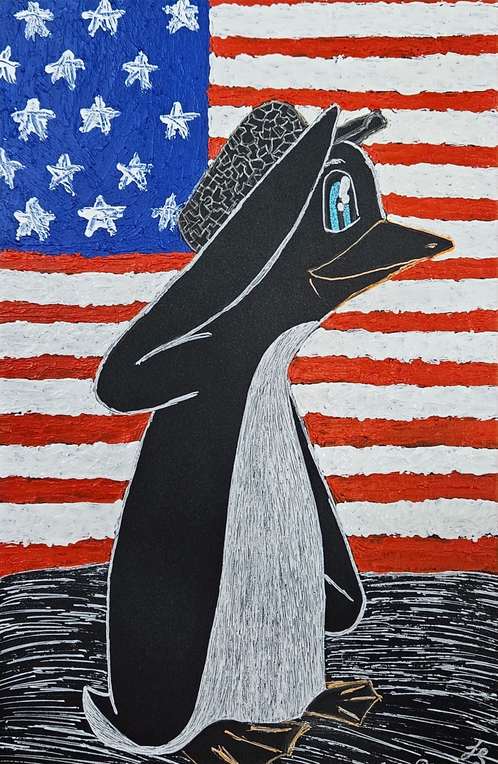 black white line, drawing, illustration, military, mixed media, painting, pen and ink, penguin, veterans