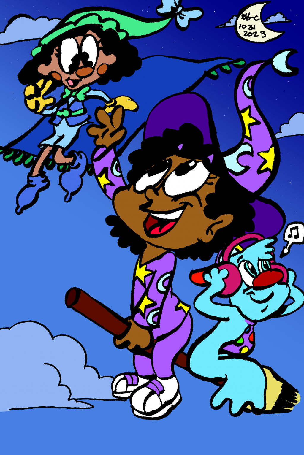 My "Enchanted Portals" fan character Wilma (the wizard in blue) and my little witch girl Wilma and her ghost friend Spookers have a nice little night flight.