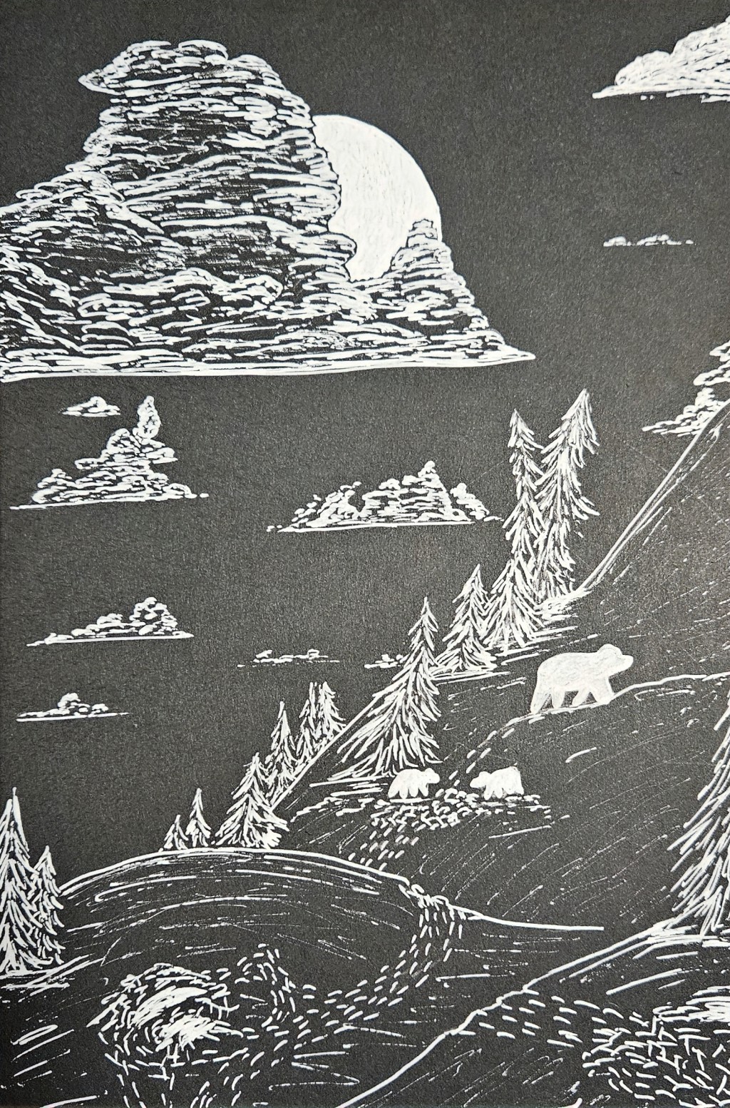 bears, drawing, illustration, landscapes, pen and ink, winter