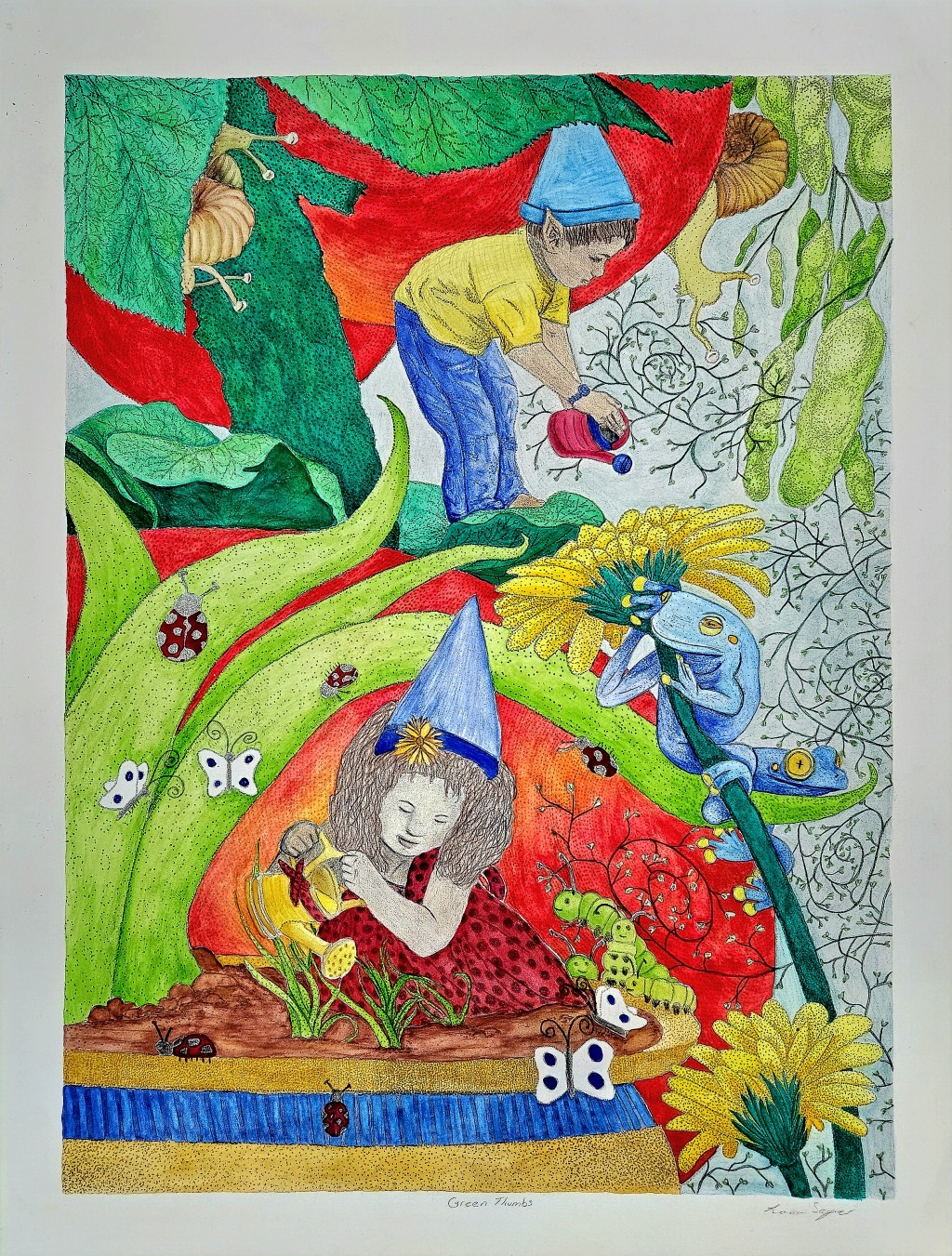 art, drawing, fantasy, gnomes, illustration, lithography, mixed media, nature, watercolor