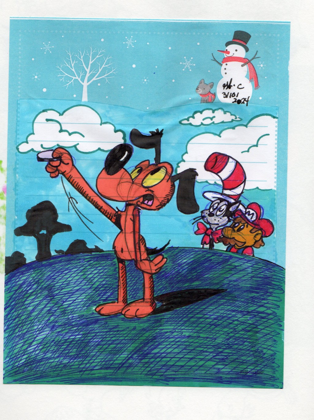 Seeing as how it's both "Mario Day" and Dr.Seuss's birthday, I drew something really random. Super Mario and the Cat and the Hat are there, but are just looking at the dog with the coin.