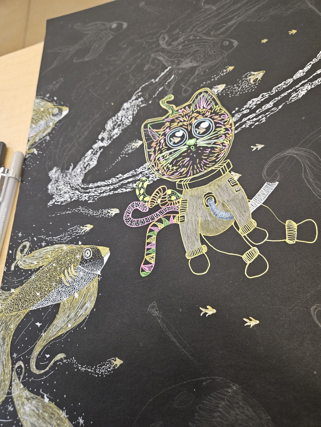 cat, drawing, fantasy, fishes, illustration, pen and ink, space