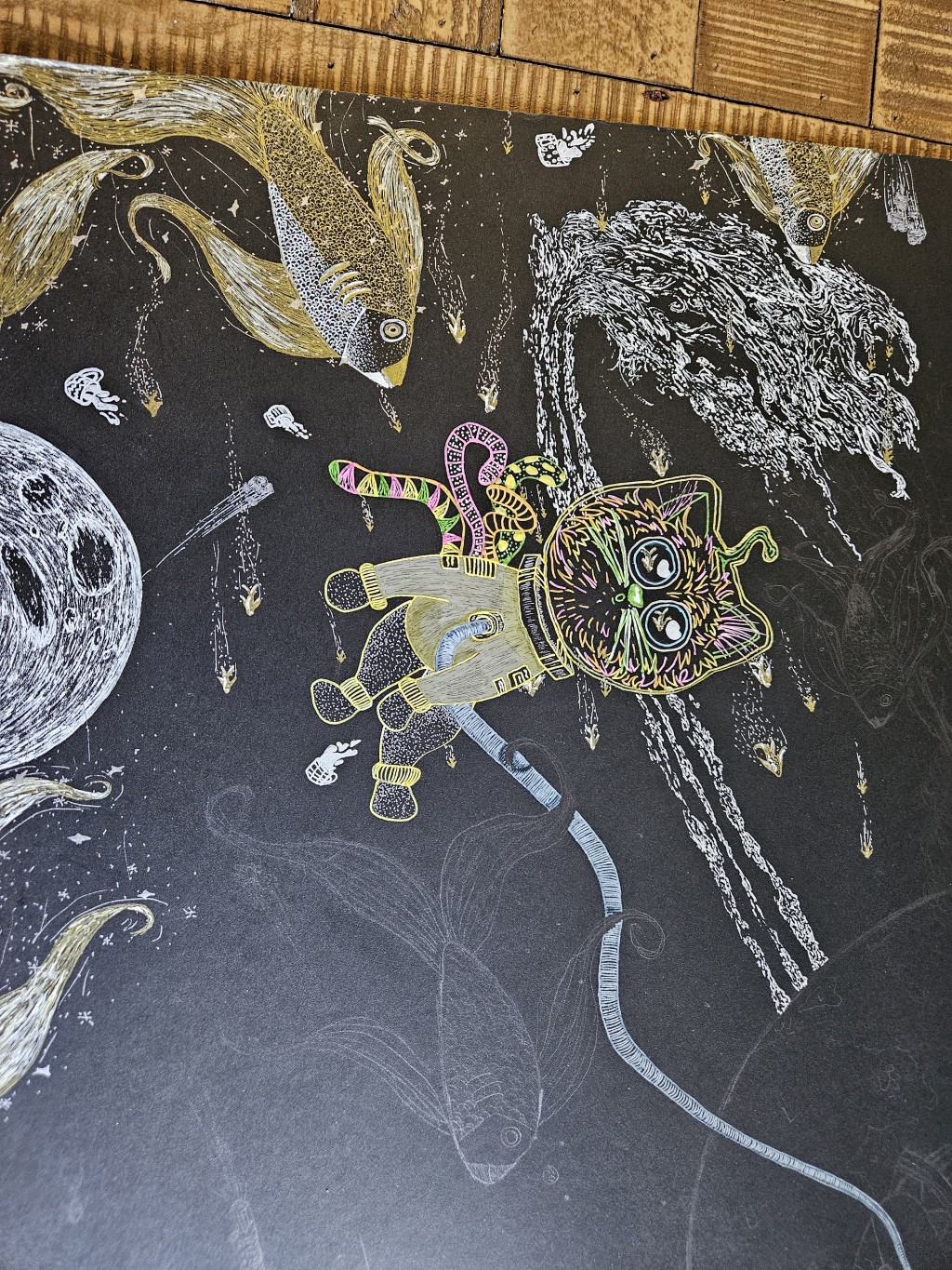 cat, drawing, fantasy, fishes, illustration, pen and ink, space