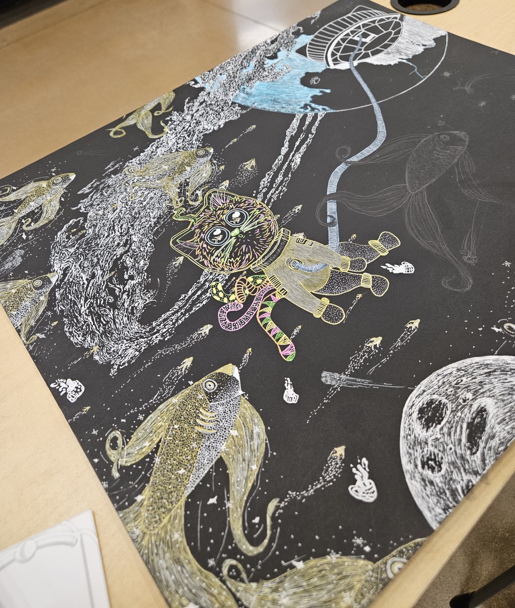 art, cat, drawing, fantasy, fishes, illustration, pen and ink, space