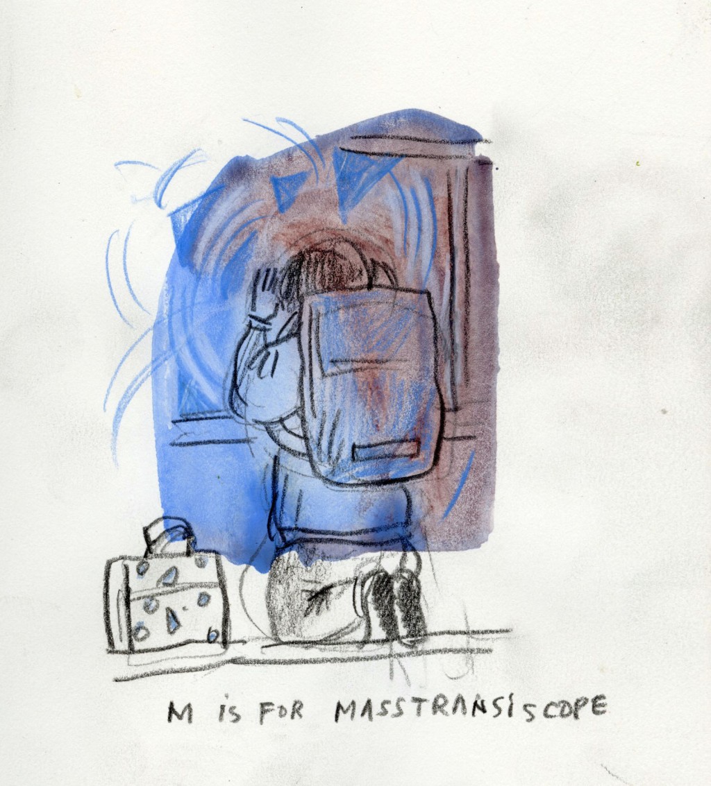 M is for Masstransitscope. Masstransitscope is a zooetrope made by Bill Brand in 80s. Now restored and enjoyed on the B line going from Brooklyn to Manhattan. It never fails to make me happy.