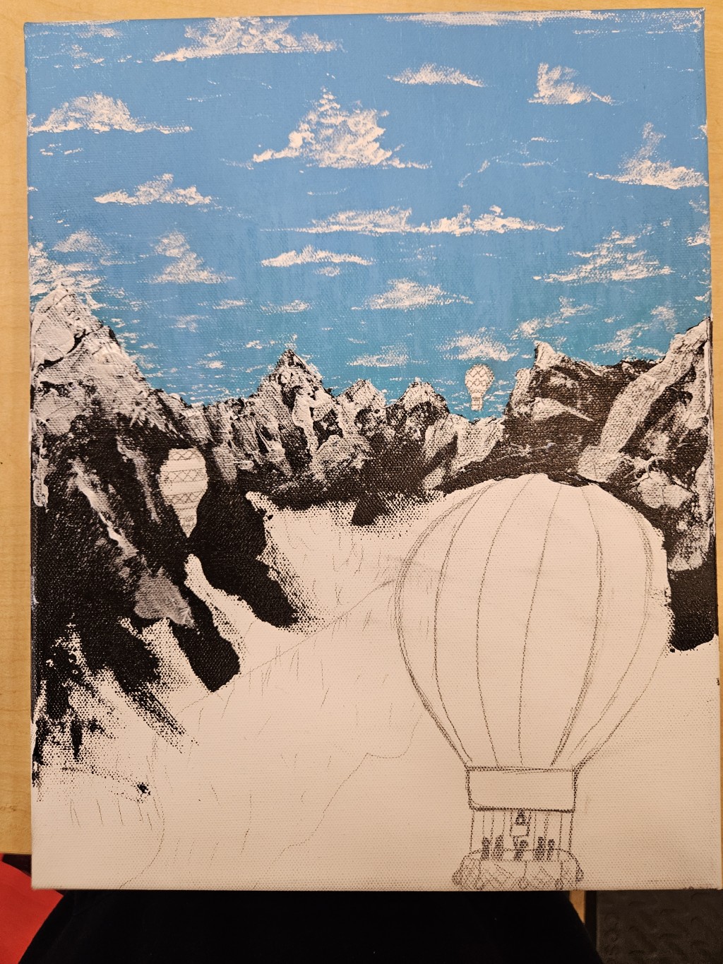 Acrylic painting that has the clouds that change depending on where the lighting comes from. Birds having fun on a Winter day.