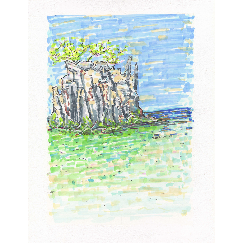 An illustration of a Thailand coastal scene is depicted with loose, expressive strokes, showcasing a rocky outcrop and the meeting of land and sea under a blue sky. Sparse vegetation sits atop the rocks, adding touches of green to the predominantly blue, green and beige tones.