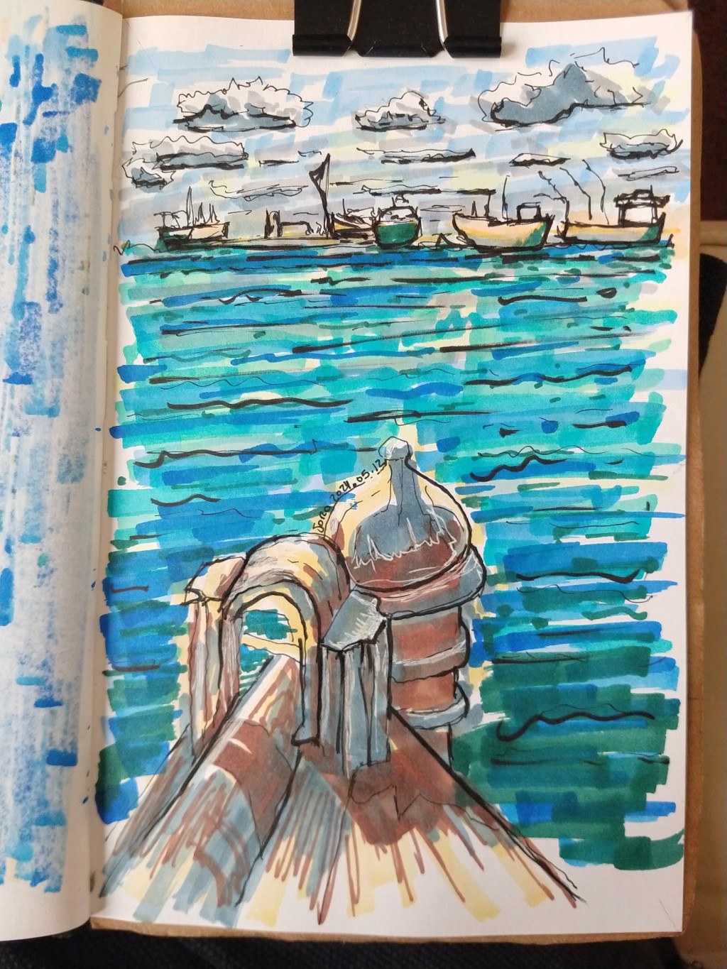 A serene coastal scene with a building structure in the foreground on a colorful blue water body, likely a canal or lagoon. In the background, there are boats floating on the water under a cloudy sky.