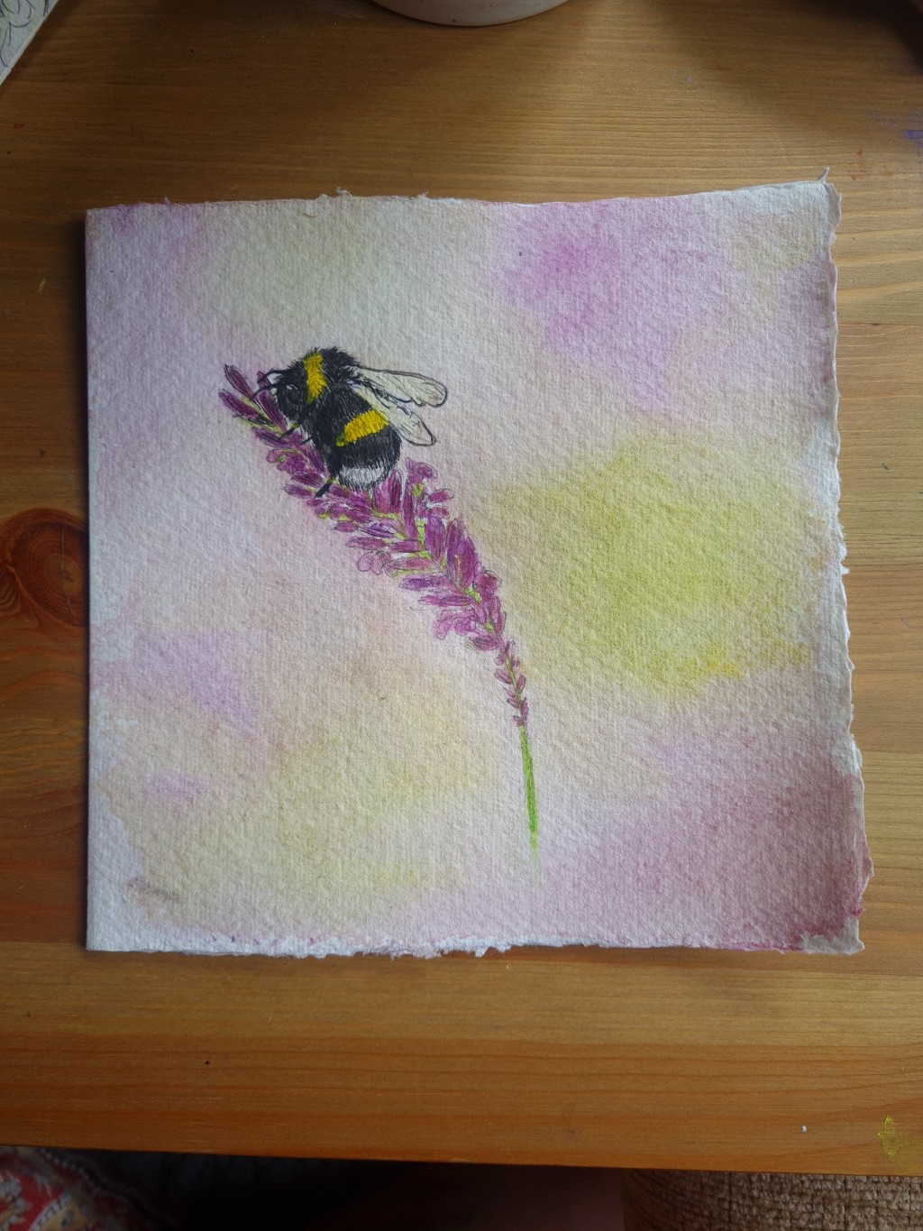 Watercolour of a bee on lavender, made as a wedding card for a friend.