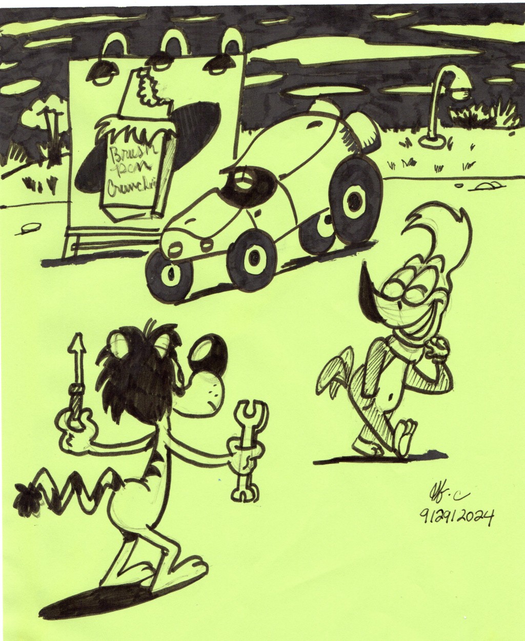 Nello the Mellow Yellow Lion has car trouble, and hopes Woody Woodpecker can help.