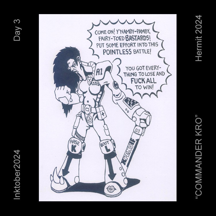 (Gel Fineliner on A5 Paper) You have to be very careful what names you give your fantasy creations. They might sound right in your own mind, but others will read them very differently. For example: He's a Kakka-Du Knight. They're known to roam the galaxy, righting wrongs and bringing peace and justice to the far reaches of space, because that's what the Kakka-Du do!