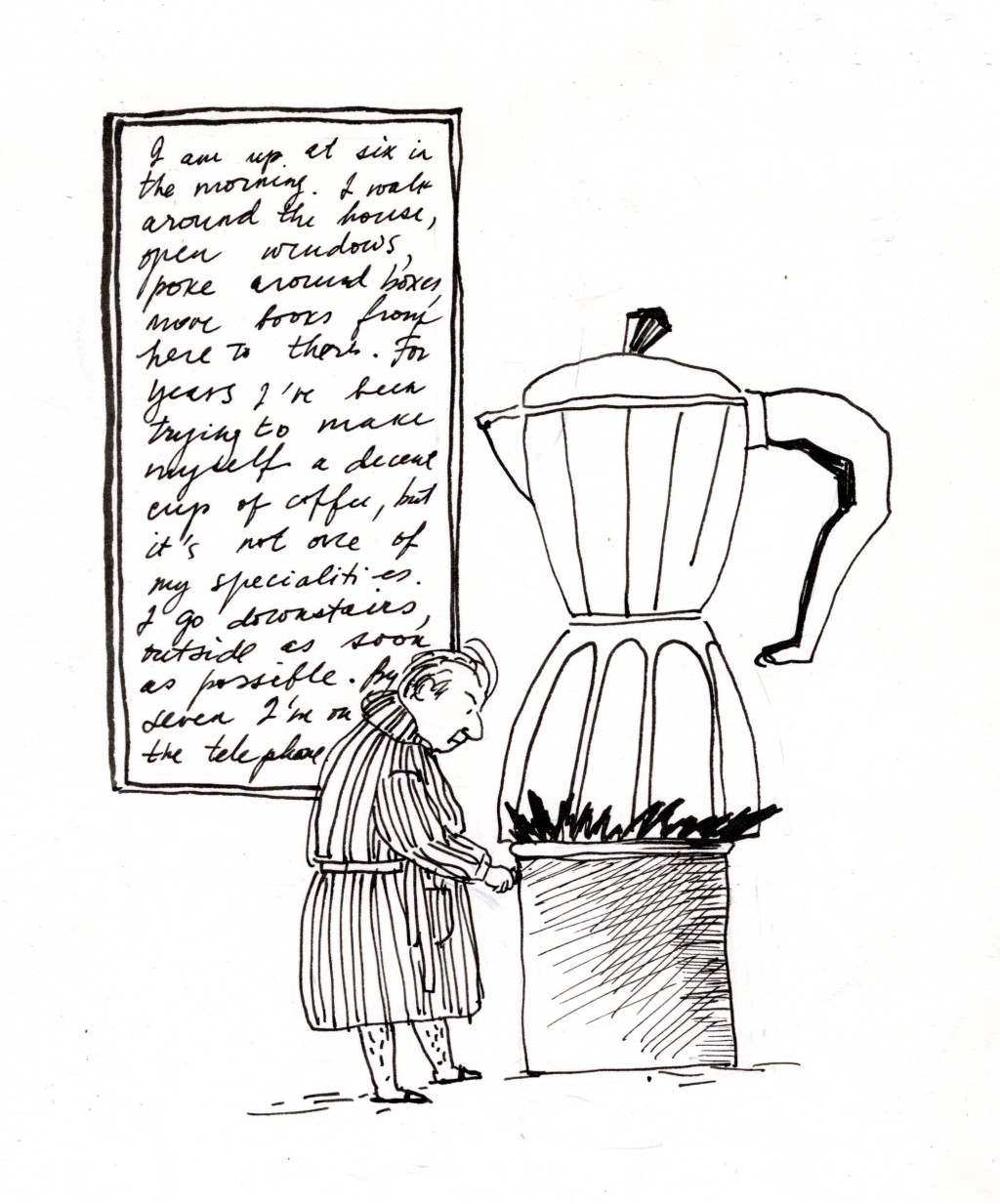 FEDERICO FELLINI In a 1977 interview, he described his morning routine: I'm up at six in the morning. I walk around the house, open sindows, poke around boxes. move books from here to there. For years I've been trying to make myself a decent cup if coffee, but it's not one of my specialties. I go downstairs, outside as soon as possible. By seven I'm on the telephone. - Daily rituals by Mason Curry. #inktober #masonCurry #federicofellini #dailyritual