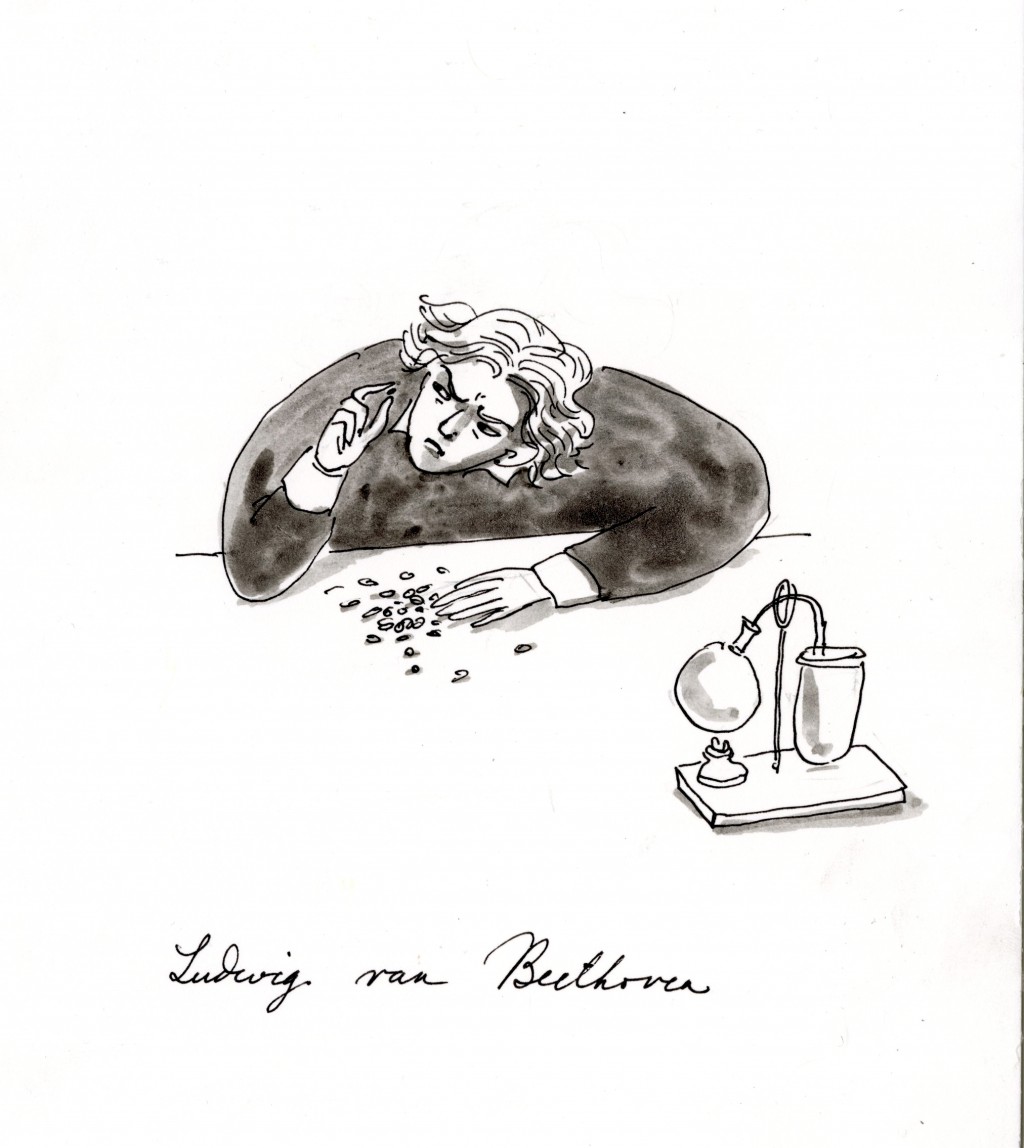 Ludwig van Beethoven (1770–1827) Beethoven rose at dawn and wasted little time getting down to work. His breakfast was coffee, which he prepared himself with great care—he determined that there should be sixty beans per cup, and he often counted them out one by one for a precise dose. From Daily Rituals : How Artists Work by Mason Currey. #dailydrawing #dailyritual #beethoven #coffee #inktober @masoncurrey
