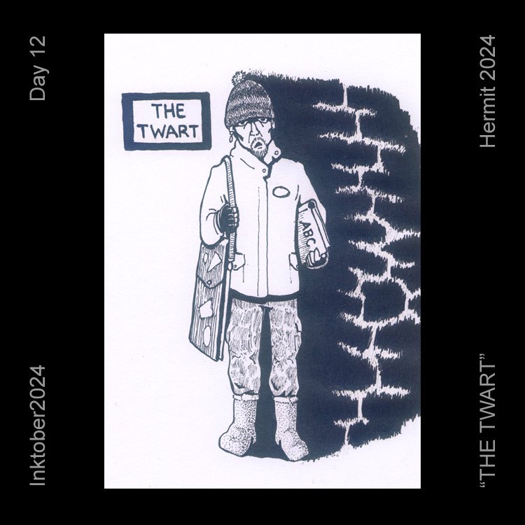 (Gel Fineliner on A5 Paper) A "Twart" is someone who tries far too hard to be an artist. Each carries the metaphorical book: "The ABC Book on How To Be An Artist" Ticking off various points they think will make them such. You can usually tell who they are by the cheesy, inoffensive work they produce and a false, bohemian, facade. Because they think that's what artist are like.