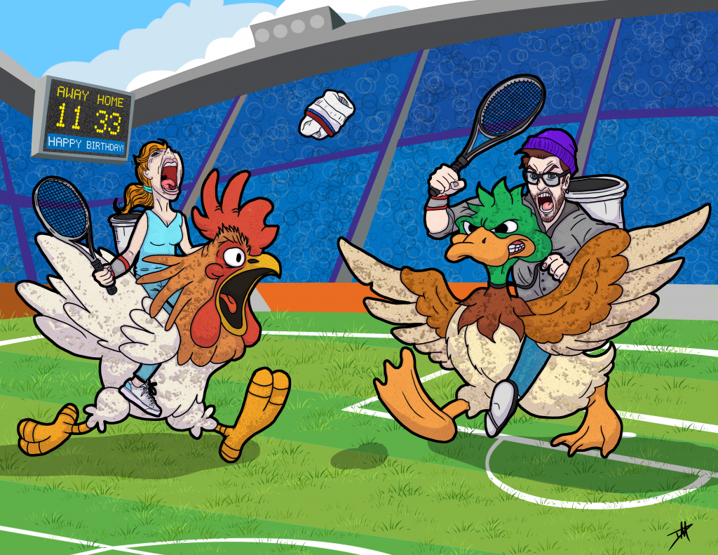 The story behind this is that when my little sister and I were kids, we invented a game called Blammer. You duct tape small trashcans to your back and try to slam a sock ball into your opponents basket. We used tennis rackets for defense. We used to terrorize our parents with all the running and yelling in the house. We're in our 30's now and try and play when we see each other. I call her Chicken and she calls me Ducky. Which is why we're are riding birds. One of my favorite pieces I've ever done. A birthday present for her.