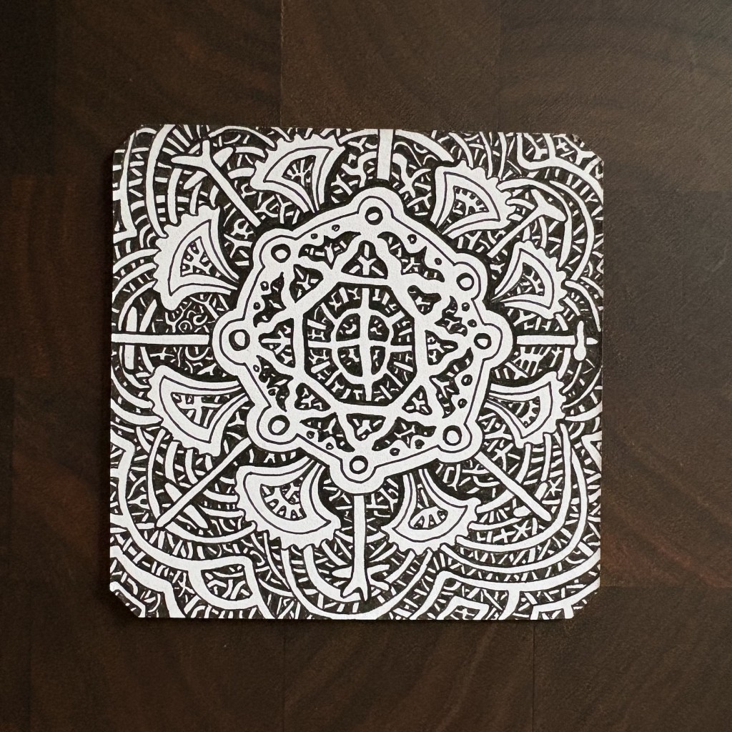 32 drawings in 3 weeks! Front & Back, 9cm square card stock, 05 Micron & Zebra Sarasa