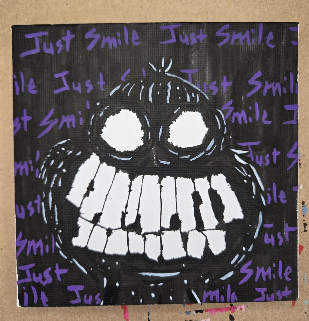 Tried something I've never done before. Taped up a canvas for the eyes and teeth. Used acrylic markers. Definitely fun to do.
