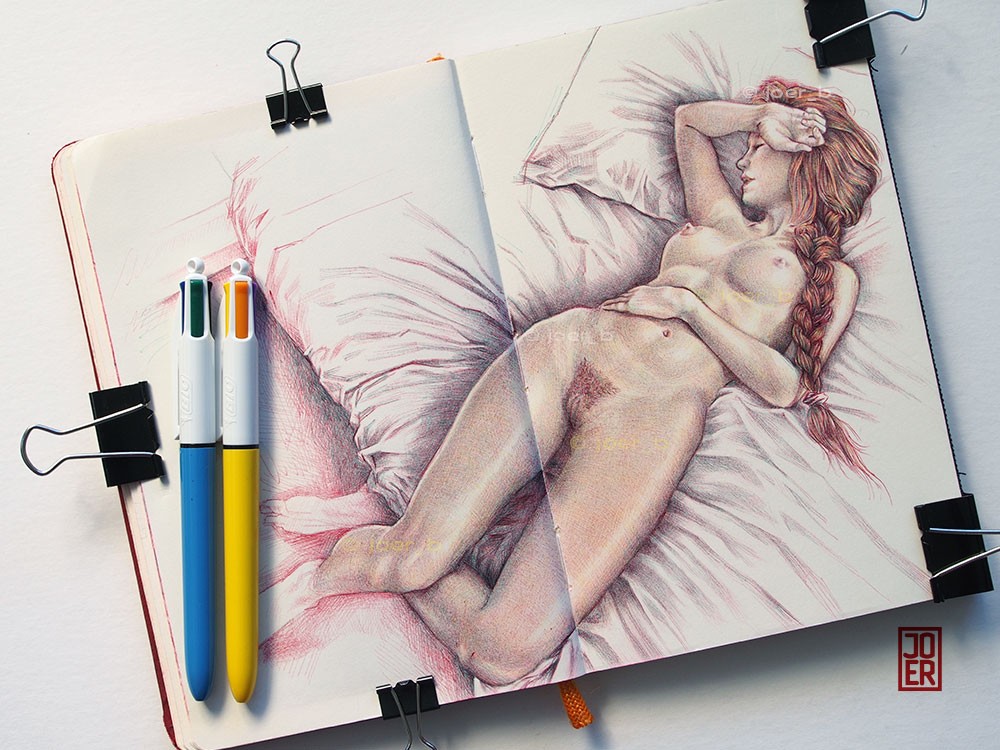 Overwhelmed...started as a little tiny sketchbook sketch and turned into my statement about recent events. It complements my previous post "Fevered Dreams." Bic ballpoint pen on archival 9” x 12” paper, scanned into Photoshop where the text overlay was added. Model: Jose