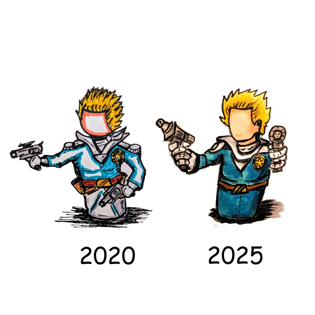 @Cameron It's some kind of fan art of Shane Gooseman, a character from Galaxy Rangers, an animated space western TV series from the late '80s. I'm bad at drawing faces, and five years ago, I also struggled with poses. So I came up with a solution: designing characters in the style of pawn-like board game pieces. The simplified design features a spherical head, a bullet-shaped body, no neck, no legs, and spherical hands. Over time, I upgraded the design slightly according to my improving skills. However, five years later, faces are still beyond my skill level—especially if I want to get close to the original character. If I leave out the face, I can imagine what I want, and it works for me.