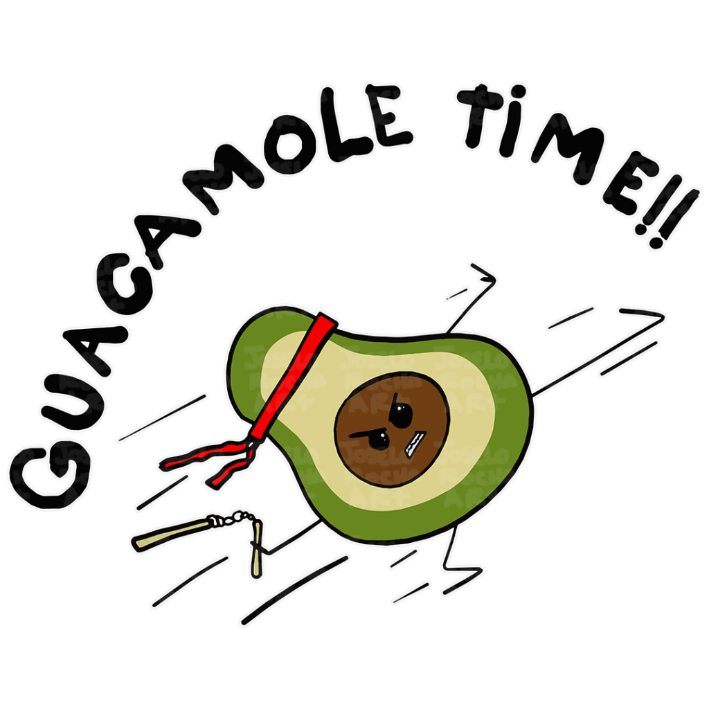 A cute avocado-martial arts character with a red headband making a flying kick and holding Nunchaku, surrounded by the words "Guacamole Time!!"