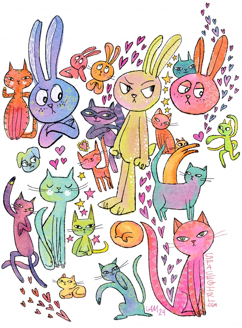 Doodles of cats, bunnies and a raccoon I did while on a flight to Barcelona in Nov 24.