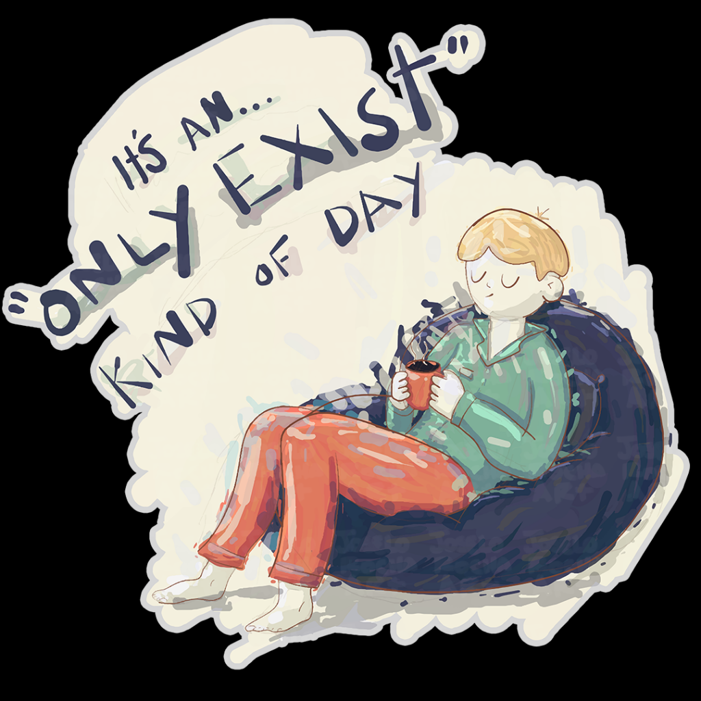 A person in a relaxed posture sits in a bean bag chair, grasping a drink while surrounded by the phrase "It's an only exist kind of day." The color palette is cozy, with muted greens and reds creating an atmosphere of calm contentment.