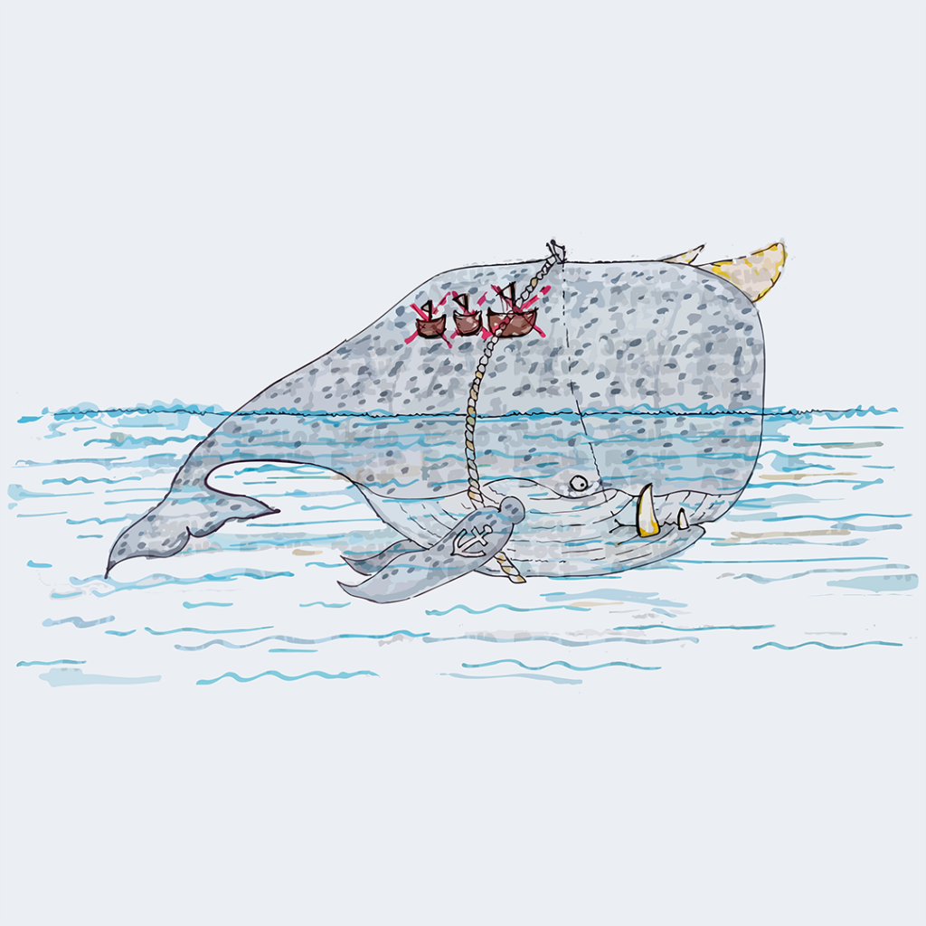 A whimsical illustration of a large horn-whale creature with fangs, an anchor tattoo on his fin, and a tattoo of how many ships he has sunk on his back, with a whale rider perched on its back, is surrounded by gentle waves. The contrast between the massive creature and the tiny rider suggests a playful narrative. The muted colors and simple lines create a charming and imaginative scene.