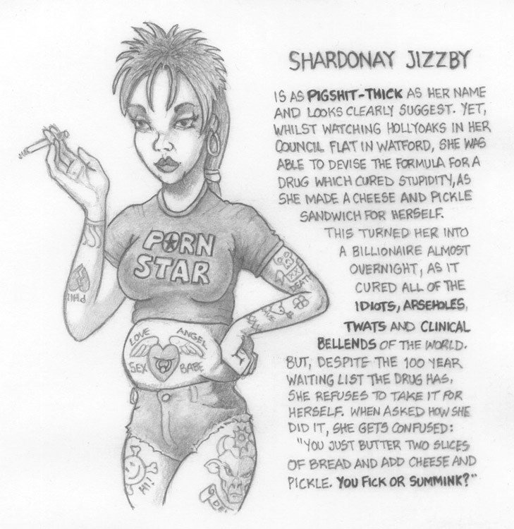 (2B pencil on 147mm x 133mm paper) "They're not flag-waving wannabes, or finger-pointing-blamemongers. They're true British Heroes! They were born with spines of steel, have spunk by the bucketload, and their upper-lips aren't just stiff, they're rock-solid! They're the type who'll kick those mad-dogs aside and proudly march, bare-arsed, into the midday sun!"