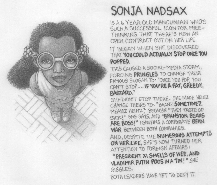 (2B pencil on 158mm x 137mm paper) "They're not flag-waving wannabes, or finger-pointing-blamemongers. They're true British Heroes! They were born with spines of steel, have spunk by the bucketload, and their upper-lips aren't just stiff, they're rock-solid! They're the type who'll kick those mad-dogs aside and proudly march, bare-arsed, into the midday sun!"