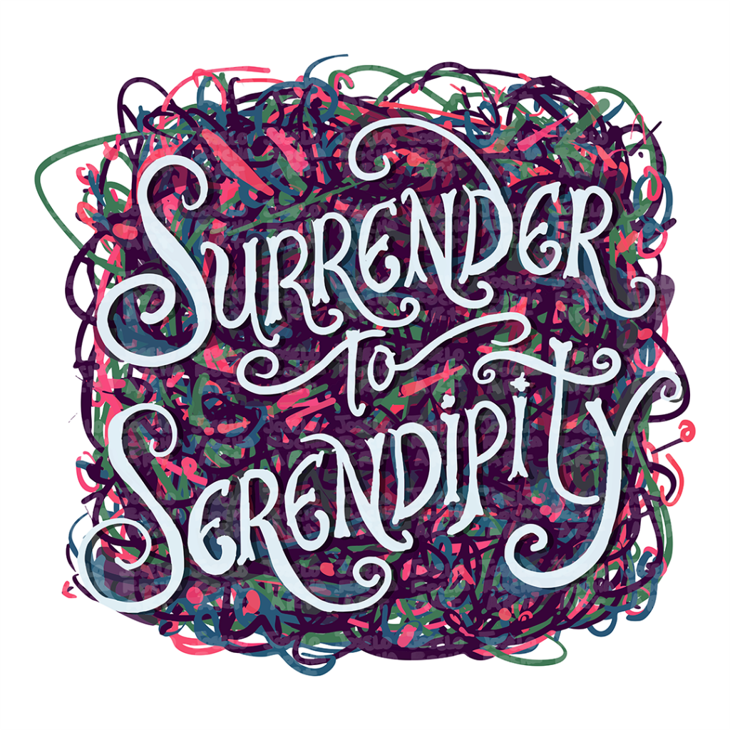 A vibrant and playful typography design with swirling colors surrounds the phrase 'Surrender to Serendipity'. The intricate lettering is set against an abstract pattern, giving it a dynamic and lively feel.