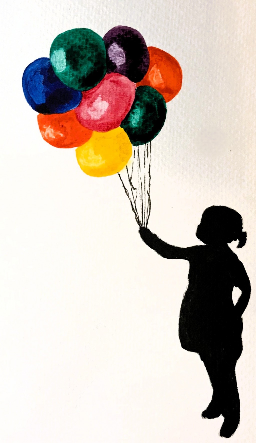 It reminds me of Banksy’s Balloon Girl. I like the color choice. The colored balloons really pop, while the girl’s silhouette appears flat. Great contrast.