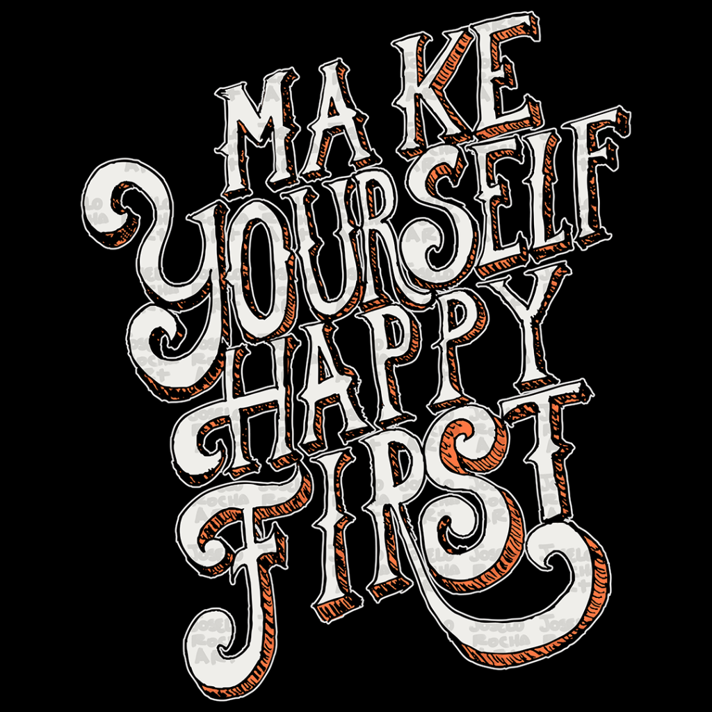 A vibrant message encourages personal happiness through bold, swirling letters that read "Make Yourself Happy First".