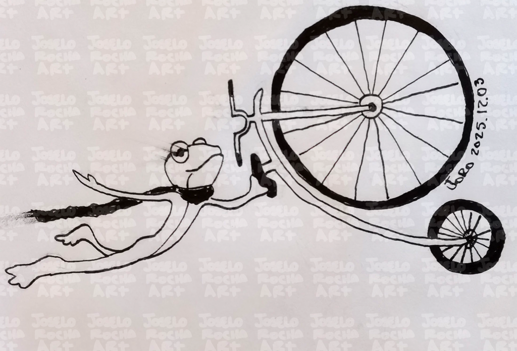 A whimsical depiction of an anthropomorphic frog making Freestyle motocross trick called "Seat Grab" in a classic penny farthing bicycle. The image is funny, humorous and minimalist, featuring a simple outline.