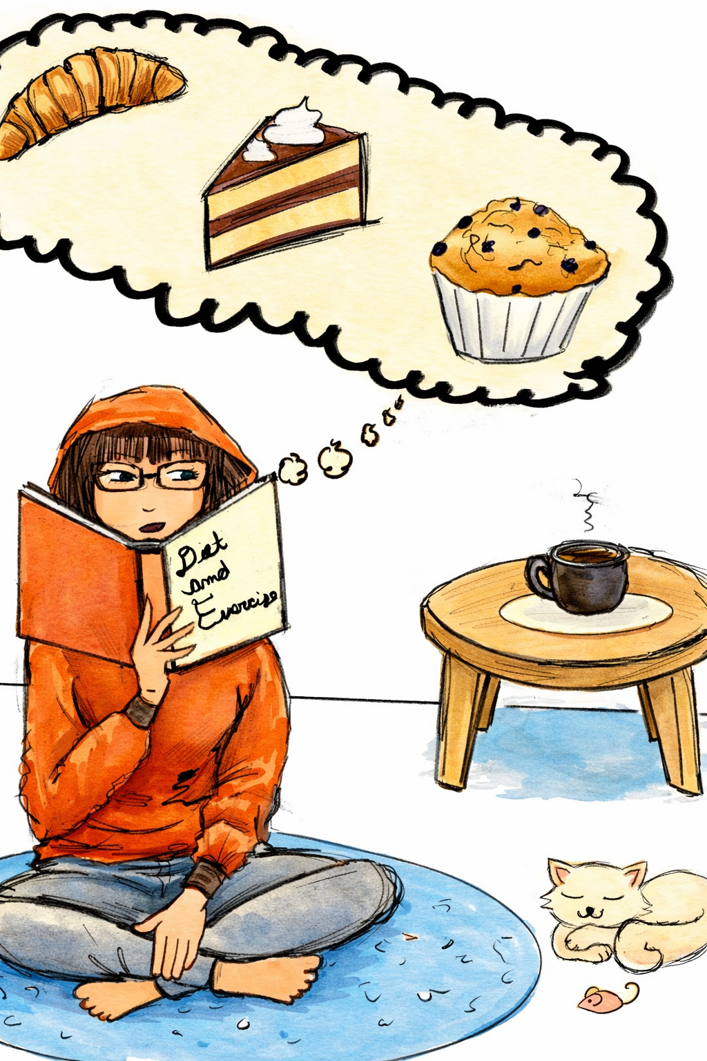 I love the way this picture was drawn, it's so cute. Cozy areas, coffee, and cats are a must have for me. Instead of croissants I would be thinking of cookies and my cat would have predicted I wanted to sit on the rug and occupied it before I got there.