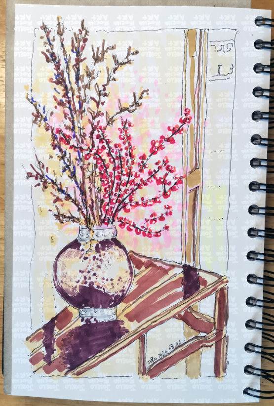 A vibrant exploration of color and line, this piece captures the ephemeral beauty of red plum blossoms in a textured, contemporary sketch style. Perfect for those who appreciate the intersection of traditional botanical themes and modern, expressive artistry.