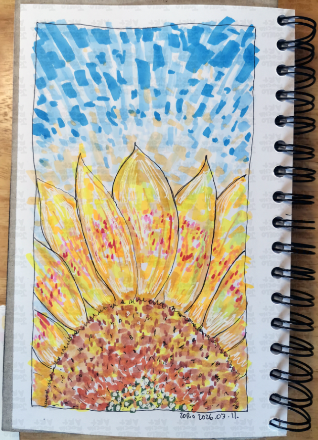 A vibrant, hand-drawn sunflower illustration featuring bold marker strokes and a rhythmic, blue-sky background. This piece captures the energy of a summer day through an impressionistic lens, blending warm yellows and oranges with cool, textured blues.