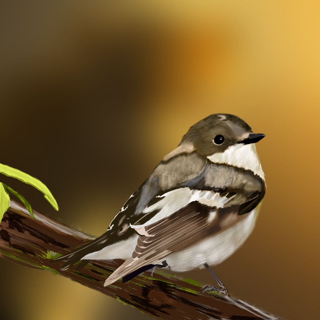 A Female Pied Flycatcher Ficedula Hypoleuca… The Pied Flycatcher is a summer migrant to the UK. As the name suggests, it feeds on flies that are caught by making a quick dash from an obvious perch. There are around 40,000 pairs in the UK each summer. The Pied Flycatcher is a small unmistakable bird that often sits with drooped wings. It spends its winter in Africa. Identification: Adult Adult males and females share the same plumage pattern but are different colours. Male Pied Flycatchers are small and chunky,13cm in length and are black and white all over, they are quite unmistakable. The upperparts are black and white, tail is black with white base to outer tail feathers, rump is a slightly paler, back is jet black, wings are black with white wing patch (tertials) The nape and head is black except for small white patch above the black bill. Chin and throat white, extending to form a half collar. The entire underparts are white, ie; chin, throat, breast, belly and undertail coverts. Legs, bill and eye black. Females are brown versions of the male although tail is dark, no obvious white patch over the bill and the collar is less distinct. #piedflycatcher #brd #birdart #birdartist #birdsketch #birddrawing #bampidraws #birdlovers
