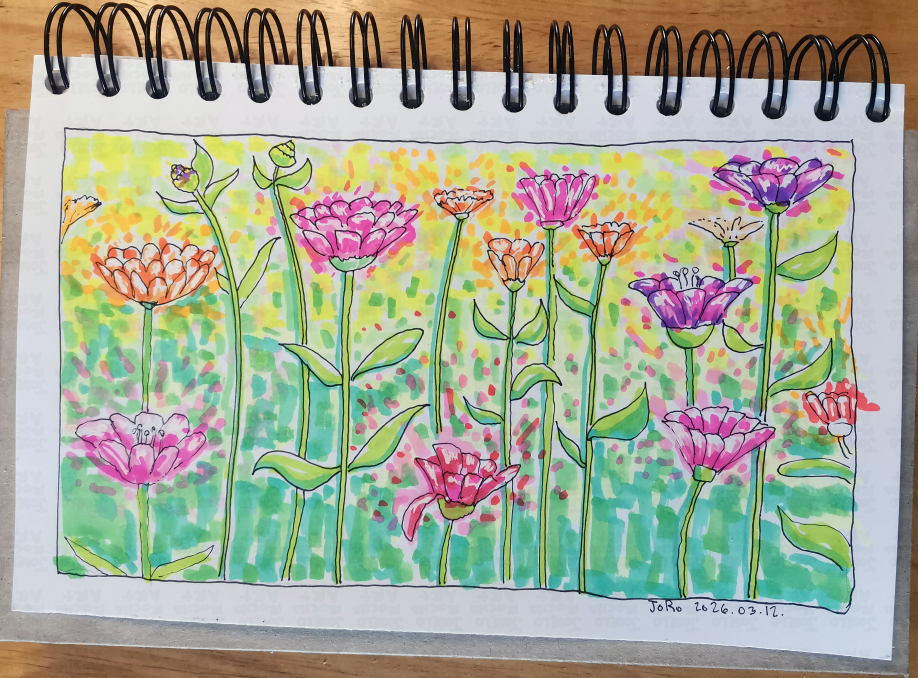 A vibrant garden scene showcasing an array of colorful flowers with tall stems. The background features a mix of greens and yellows, adding to the lively atmosphere.