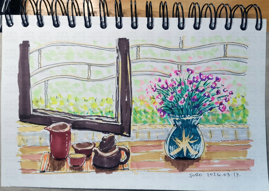 A hand-drawn illustration capturing the quiet beauty of a slow afternoon. Featuring a traditional tea set and a bursting vase of purple wildflowers against a sun-drenched window, this piece blends the "Sunday Reset" aesthetic with timeless botanical charm. Perfect for tea lovers, art collectors, and anyone looking to bring a touch of "home sanctuary" vibes to their walls.