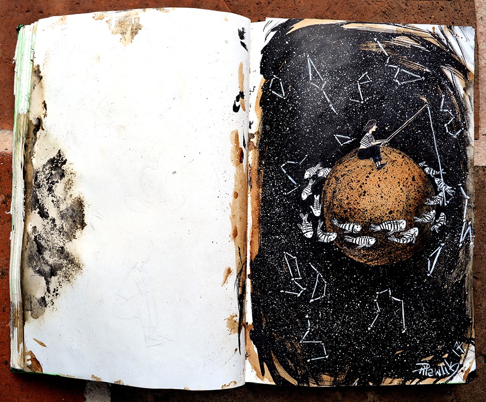 Scketchbook. Coffee and Ink. School of galaxy fish. 2017 @ Ania Pawlik 2017 Part of an upcoming collaborated animation. Littler teaser here: https://www.facebook.com/GalleryOnWheels/videos/1965707283643130/ Enjoy and stay tuned :)