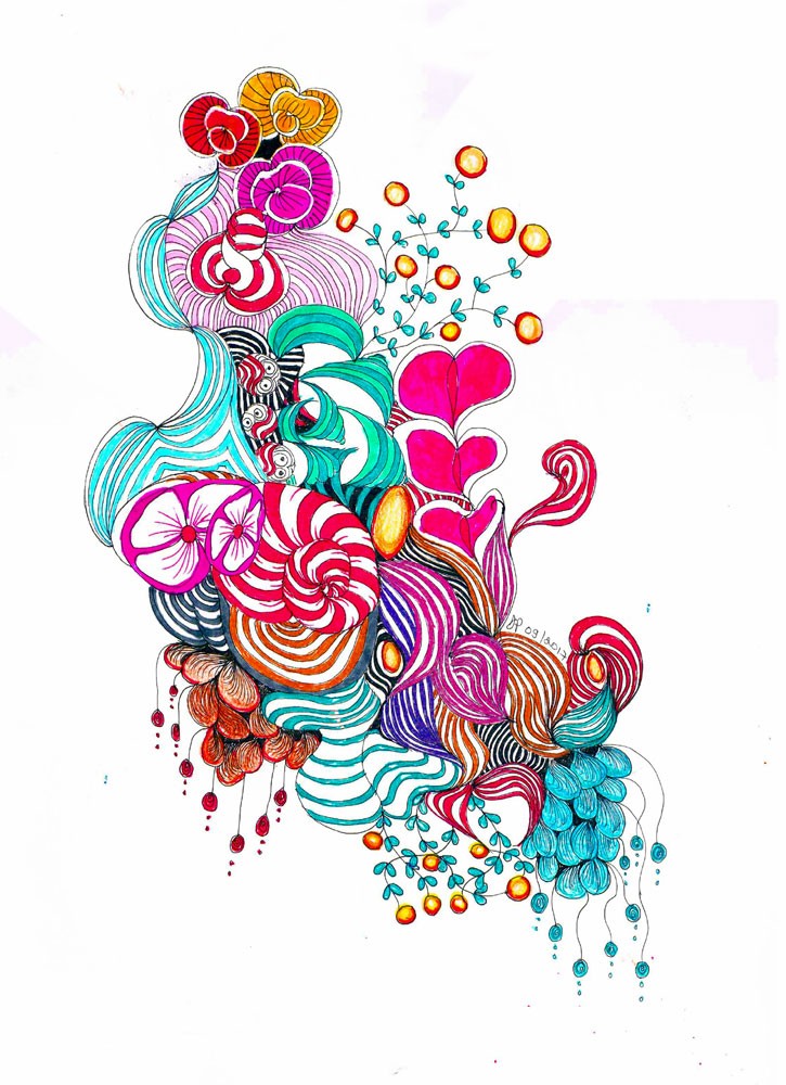Animals on the move - this is a doodle painted in acrylics. I start by throwing colours down, then look for something to make into an element. It all takes about as long as a drawn doodle does and there is no prior plan and I do not do any drawing at all!