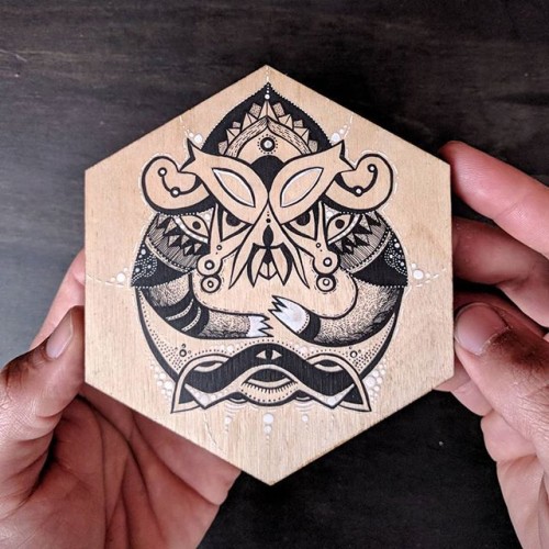 A birch plywood hexagon. Painted by hand. I wonder about the masks we wear.