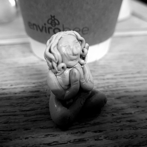 When I am anxious I stim. When I am anxious at a café that I frequent, they give me Blu Tack to fiddle with. I make little models, and this is one of them. It is supposed to be me, meditating.
